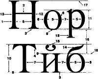1 - осн. штрих; 2 - соединительный штрих; 3 - засечка; 4 - вертикальная засечка; 5 внутрибуквенный просвет; 6 - наплыв; 7 межбуквенный просвет; 8 - линия шрифта, или нижняя линия шрифта; 9 - верхняя линия строчных округлых букв; 10 - высота прописных букв; 11 - высота строчных букв; 12 - оптическая середина прописных букв; 13 - нижний выносной элемент; 14 - верхний выносной элемент; 15 - диакритический знак; 16 - интерлиньяж (междустрочный пробел); 17 - верхняя линия прописных букв; 18 - верхняя линия строчных букв