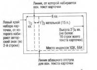 Примерные размеры макета карточки при формате издания 84×108 в 1/32 долю при формате набора в 5 1/2 кв.: общий формат набора карточки 5 1/2 кв., отступ для осн. текста карточки 1/2 кв., абзацный отступ для осн. текста карточки 15 п., общая высота набора карточки 3 кв.