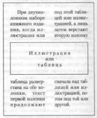 4) если при М. в. в книжных изданиях заверстанные на все или на несколько смежных колонок таблицы или иллюстрации разрезают текст, то его разверстывают так, чтобы текст каждой колонки переходил через таблицу или иллюстрацию, продолжаясь под нею; напр.: