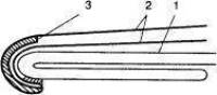 2) П. ф. с окантовкой узким коленкоровым фальчиком - отличается от предыдущего тем, что с внутренней стороны отогнутой кромки форзаца 2 к ней приклеивают коленкоровую полоску (фальчик 3), повышающую его прочность (1 - тетрадь):